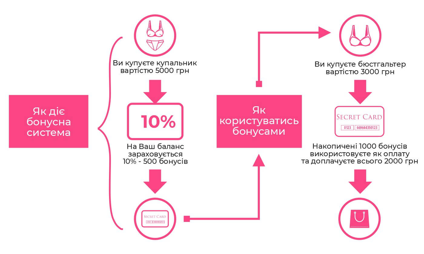 Для всіх покупців в мережі магазинів Secret Shop діє програма лояльності, згідно з якою, за кожну покупку покупець отримує на свій рахунок бали. Формула нарахування балів дорівнює 1:10, тобто 10 гривень = 1 бонус.